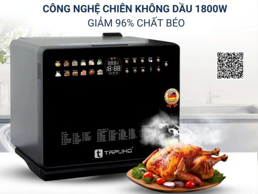 Máy nấu ăn đa năng Tapuho TMC20 PrimeAI được trang bị công nghệ chiên không dầu với công suất 1800W và quạt đối lưu 360° giúp khí nóng luân chuyển mạnh mẽ, làm thực phẩm chín đều, vàng giòn mà không cần lật trở. Công nghệ này giúp giảm tới 96% lượng chất béo dư thừa, giữ trọn vị ngon tự nhiên và lành mạnh hơn cho sức khỏe.