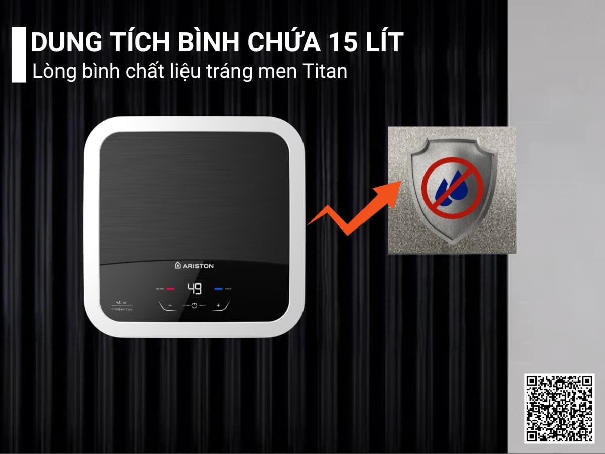 Bình chứa nước của máy có dung tích 15 lít, đáp ứng tốt nhu cầu sử dụng của 1-2 người. Lòng bình chất liệu tráng men Titan cao cấp, chống ăn mòn, độ bền cao và an toàn để chứa nước.