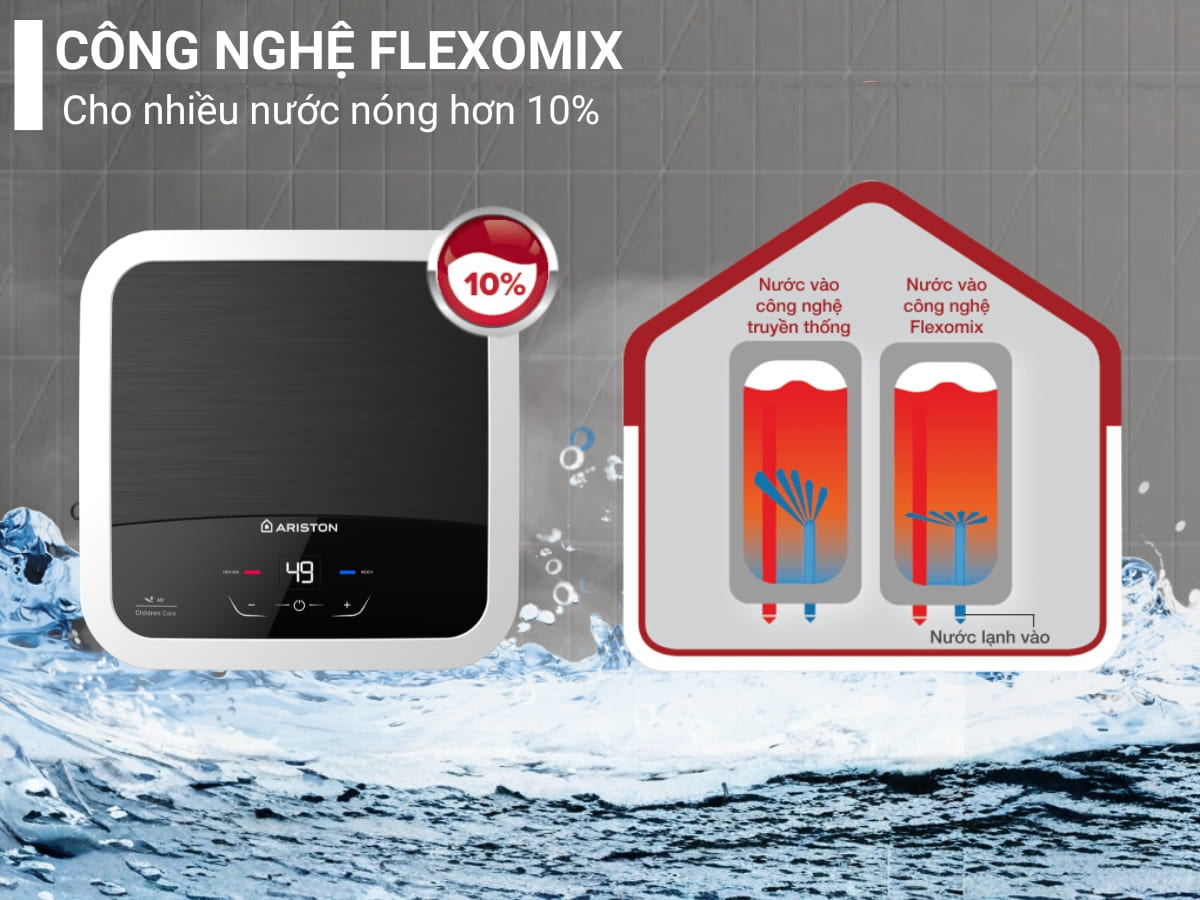 Máy được trang bị công nghệ Flexomix, một hệ thống ống dẫn nước vào hiệu suất cao, cho phép cung cấp lượng nước nóng nhiều hơn 10% so với các máy nước nóng truyền thống, đảm bảo sự thoải mái tối đa.
