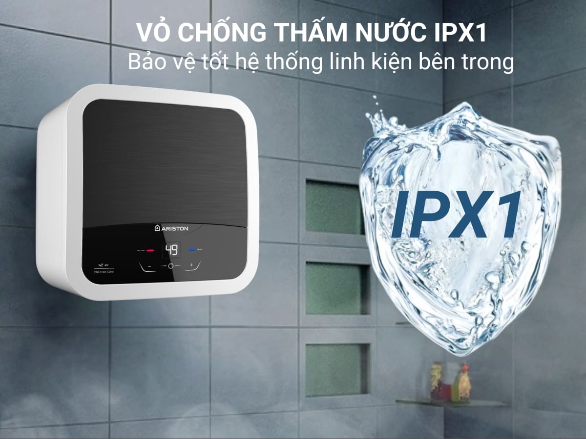 Máy nước nóng Ariston Andris2 Lux 15 có phần vỏ máy được chế tạo với khả năng chống thấm nước theo tiêu chuẩn kháng nước IPX1, bảo vệ các linh kiện điện tử bên trong khỏi môi trường ẩm ướt của phòng tắm..