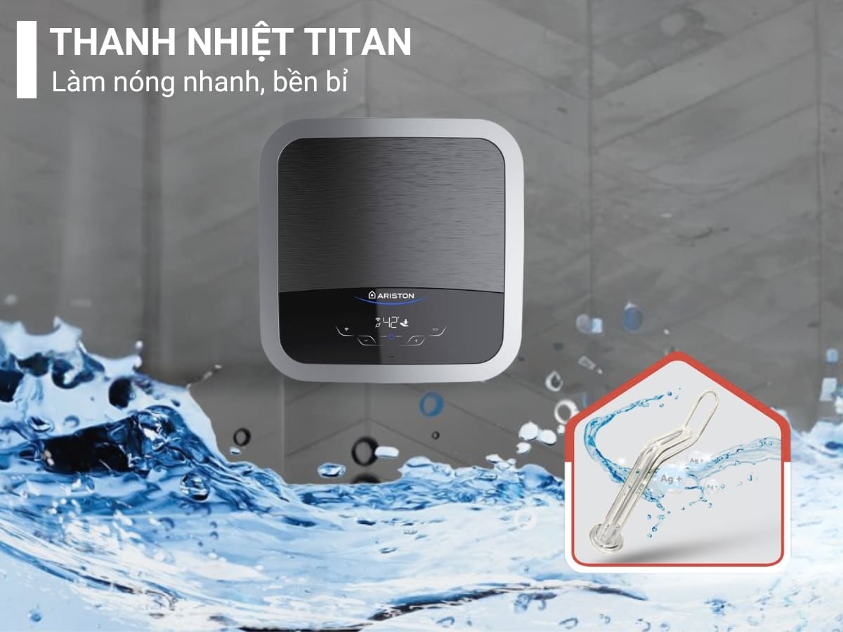 Máy nước nóng Ariston Andris2 Top Wifi 15 sử dụng thanh đốt 100% làm bằng Titan cho khả năng gia nhiệt nhanh, siêu bền bỉ nhờ khả năng chống ăn mòn tuyệt đối, hạn chế bám cặn trong suốt quá trình sử dụng.