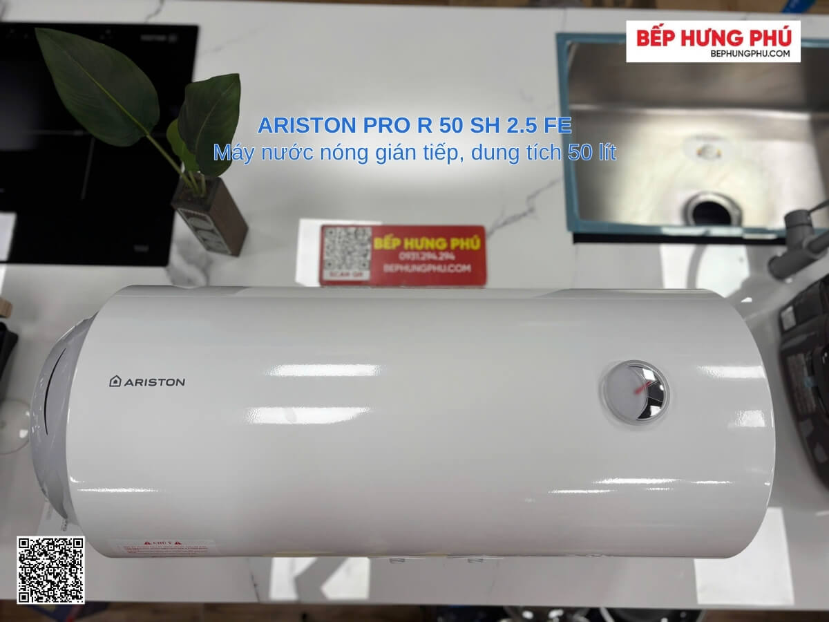 Máy nước nóng Ariston PRO R 50 SH 2.5 FE là dòng gián tiếp với bình chứa 50 lít, phù hợp gia đình 4‑5 người. Lòng bình tráng men Titan bền bỉ, công suất 2500W cùng thanh nhiệt Titan làm nóng nhanh, đáp ứng nhu cầu tắm gội kể cả ngày đông. Máy tích hợp nhiều tính năng an toàn như cầu dao chống giật, cảm biến tự ngắt khi quá nhiệt, van xả áp và vỏ chống thấm nước, bảo vệ người dùng tối ưu.