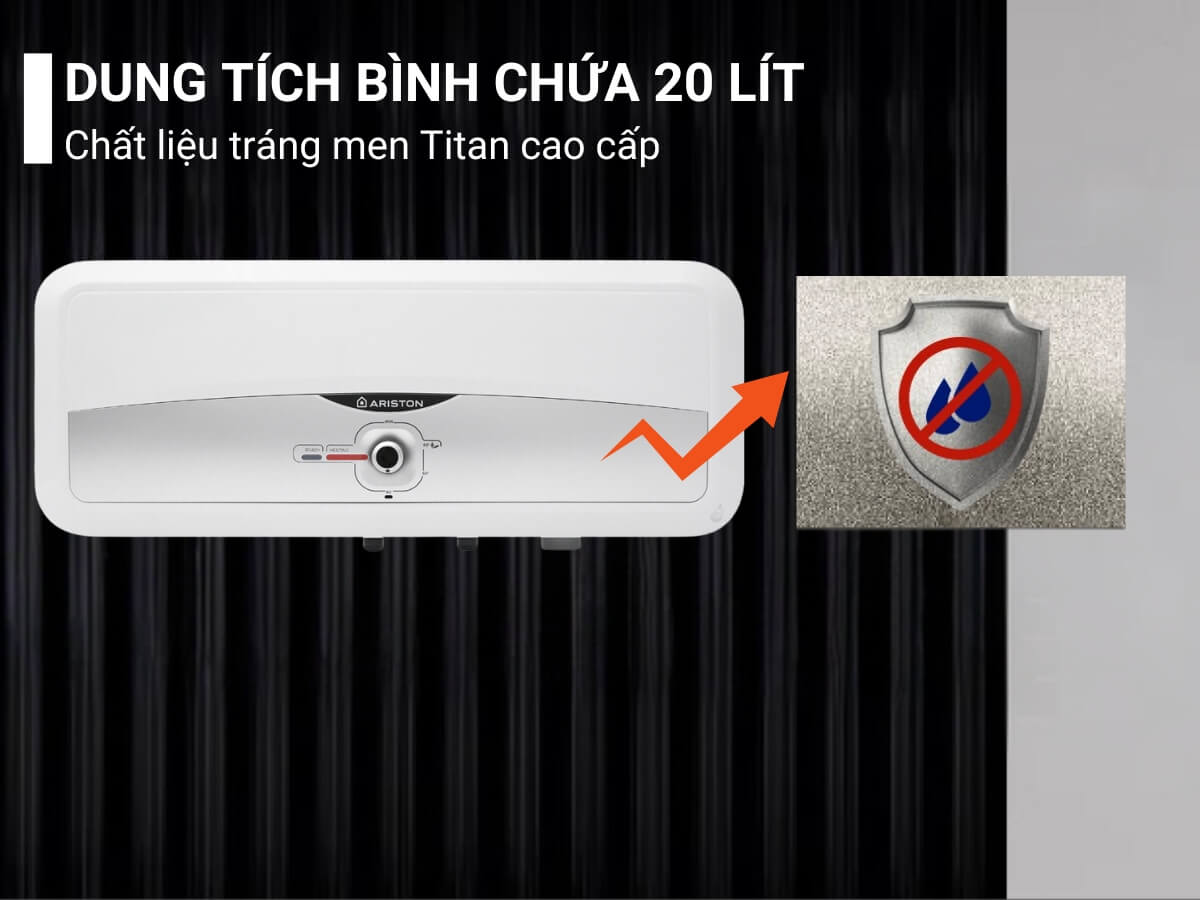Dung tích bình chứa 20 lít, chất liệu tráng men Titan cao cấp