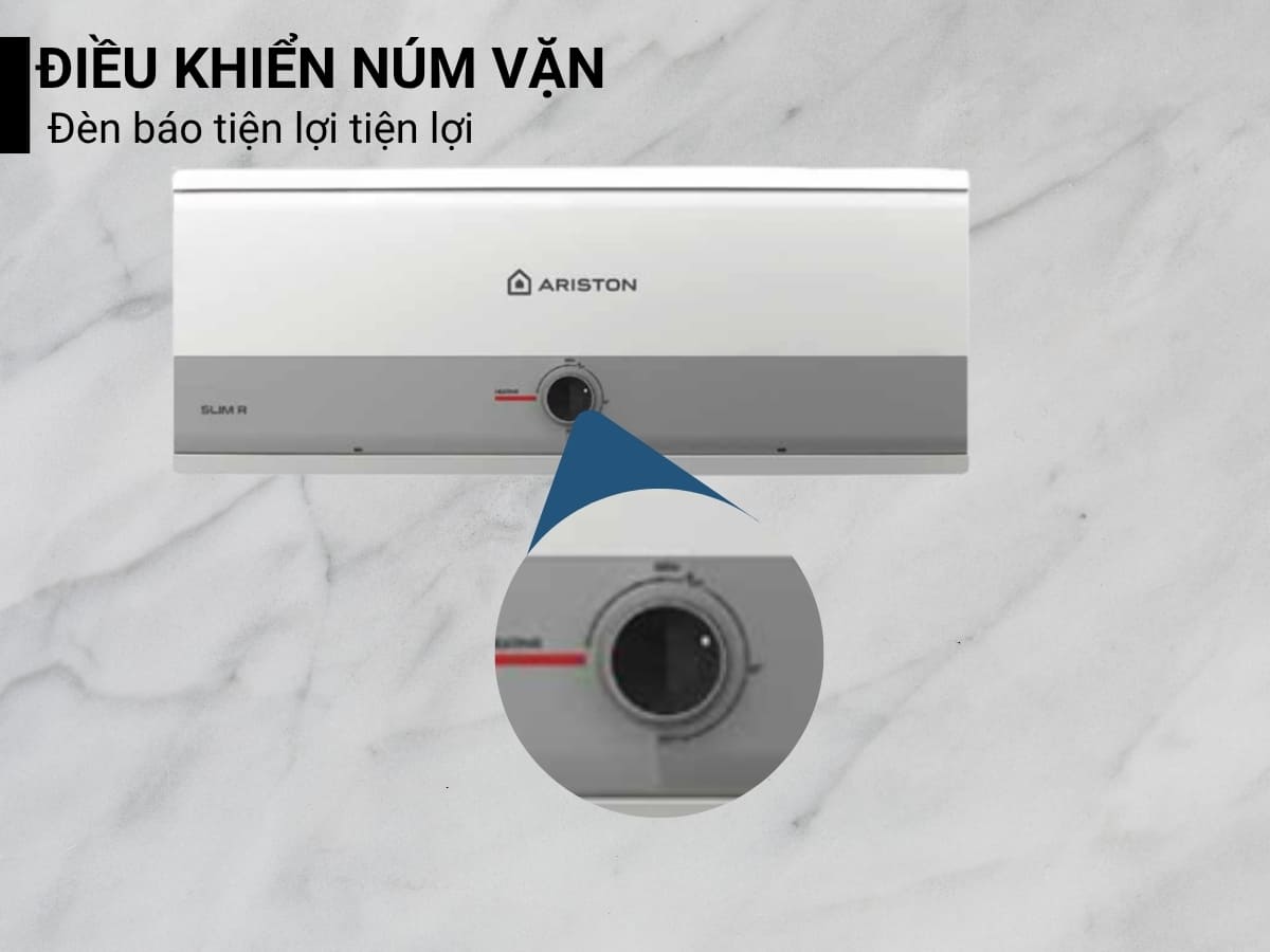 Máy nước nóng Ariston Slim3 30R VN trang bị một núm vặn để điều khiển bật/tắt máy và tăng/giảm nhiệt độ nước theo nhu cầu, sử dụng đơn giản, dễ dàng. Bên cạnh đó còn có 2 đèn báo riêng biệt : Đèn đỏ báo nước đang đun nóng và đèn xanh dương báo nước đã sẵn sàng sử dụng