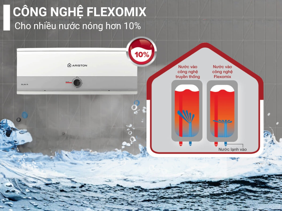 Máy nước nóng Ariston Slim3 30R VN được trang bị công nghệ Flexomix, một hệ thống ống dẫn nước vào hiệu suất cao, cho phép cung cấp lượng nước nóng nhiều hơn 10% so với các máy nước nóng truyền thống, đảm bảo sự thoải mái tối đa.