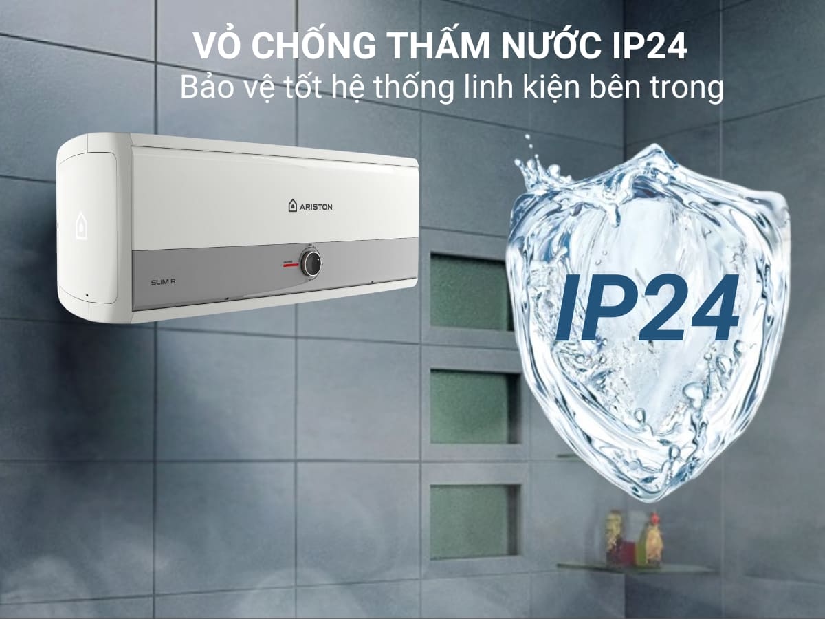 Máy nước nóng Ariston Slim3 30R VN có phần vỏ máy được chế tạo với khả năng chống thấm nước theo tiêu chuẩn kháng nước IP24. Vì vậy có thể bảo vệ tốt các linh kiện bên trong cũng như đảm bảo tuổi thọ sản phẩm và an toàn cho người dùng.