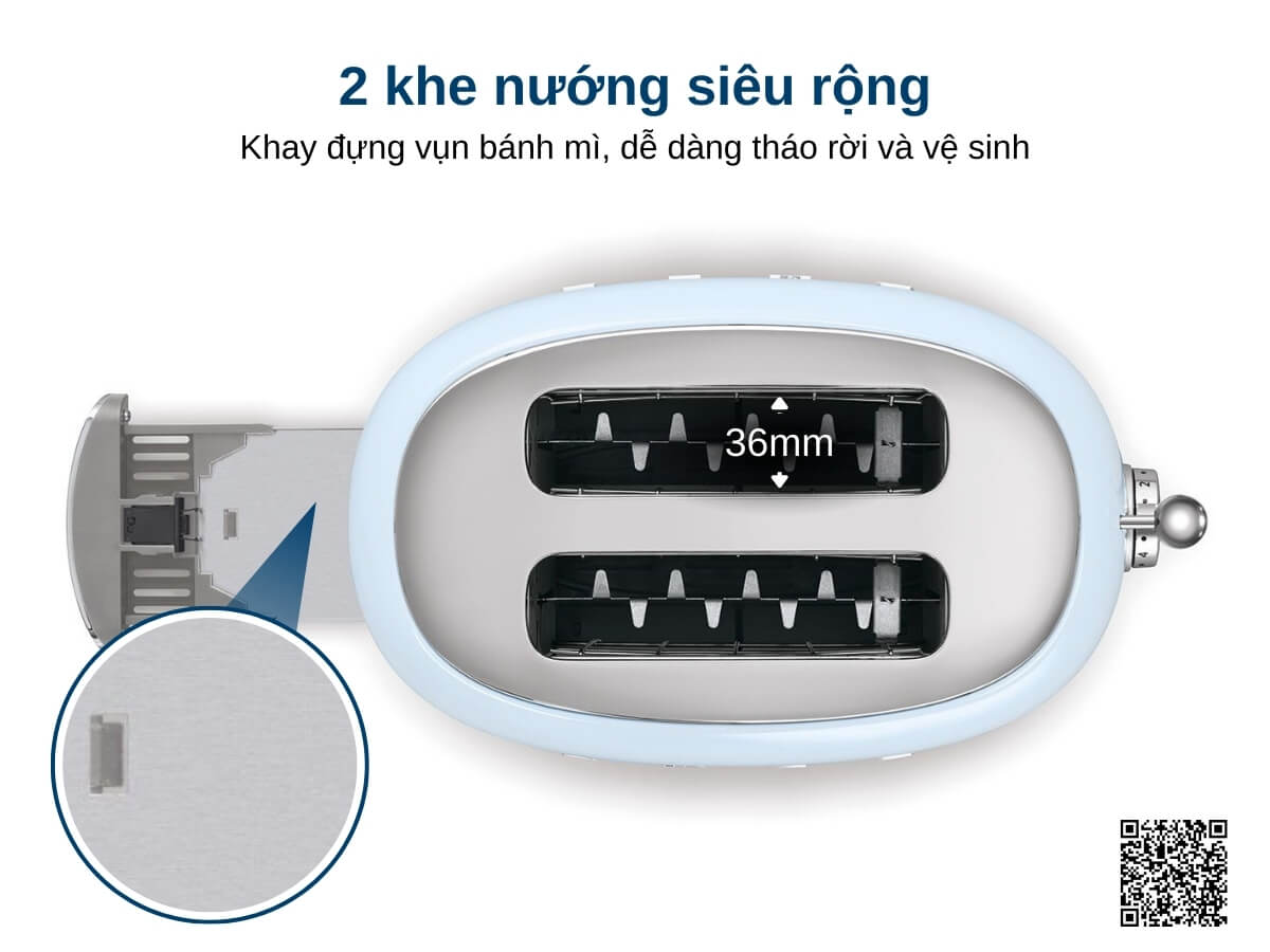 Máy nướng bánh mì Smeg TSF01PBEU nổi bật với màu xanh dương pastel tinh tế, mang đến vẻ đẹp sang trọng cho căn bếp của bạn. Thiết kế nhỏ gọn nhưng hiện đại, phù hợp với mọi không gian bếp. Sản phẩm được trang bị 2 khe nướng siêu rộng 3.6cm, giúp bạn thoải mái nướng nhiều loại bánh mì với kích thước khác nhau, đồng thời các khe được thiết kế thông minh giúp bánh mì chín đều. Với công suất 950W, máy đảm bảo hiệu suất nướng cao, giúp những lát bánh mì vàng ruộm và giòn ngon, sẵn sàng thưởng thức ngay sau khi nướng.