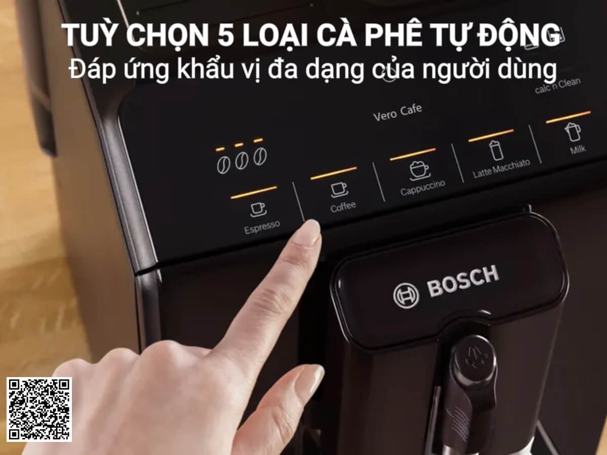 Máy pha cà phê Bosch TIE20119 cung cấp 5 loại cà phê tự động gồm: Cappuccino, Espresso, Sữa nóng, Cà phê, Latte Macchiato. Bạn chỉ cần nhấn chọn loại cà phê yêu thích, bạn sẽ có ngay cốc cà phê thơm ngon đúng chuẩn. Ngoài pha cà phê còn có thể đun nước để pha trà vô cùng tiện lợi.