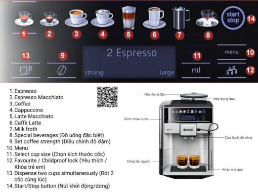 • Tuỳ chọn 12 loại cà phê: cà phê đen, Espresso, Lungo Espresso, cà phê đá…