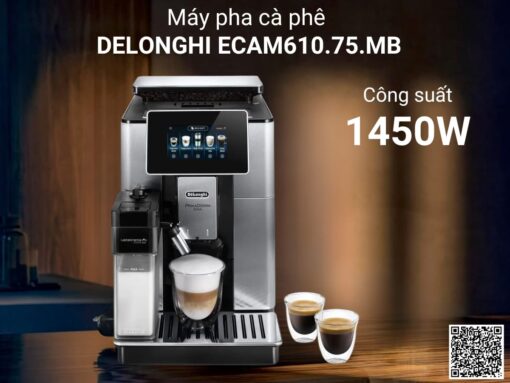 Máy pha cà phê Delonghi ECAM610.75.MB hoạt động với công suất 1450W và áp suất bơm 19 bar chuyên nghiệp, đảm bảo chiết xuất cà phê nhanh chóng và tối ưu. Hệ thống gia nhiệt Thermoblock giúp kiểm soát nhiệt độ chính xác. Bên cạnh đó, các tiện ích như khay hâm nóng tách, ngăn chứa hạt 400g, chế độ tiết kiệm điện và khả năng tự động tắt/mở máy mang lại trải nghiệm sử dụng vô cùng tiện lợi.