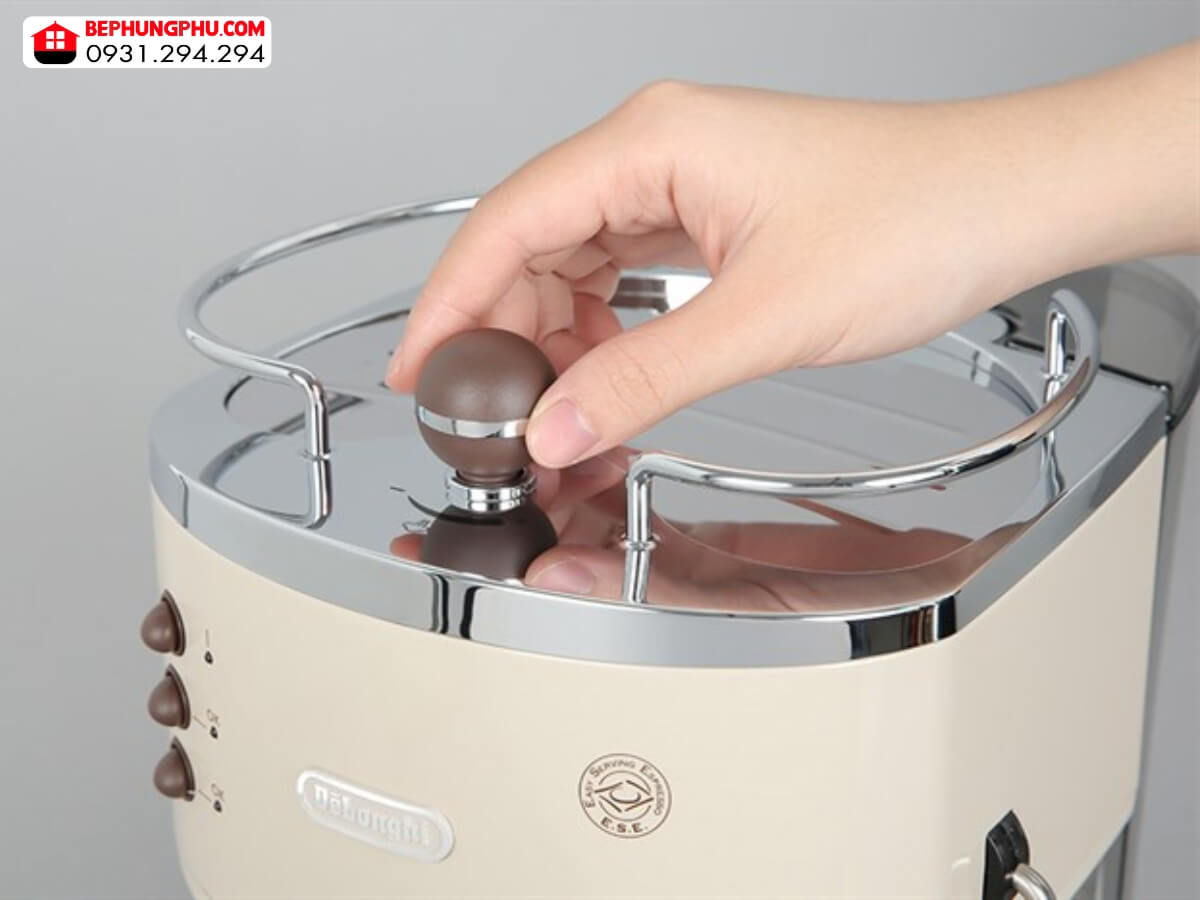 Máy pha cà phê DeLonghi ECOV311.BG có kích thước khá nhỏ gọn, dễ dàng bố trí trong không gian mà không chiếm nhiều diện tích. Máy được thiết kế cổ điển Icona Vintage phong cách Ý sang trọng với vỏ máy bằng kim loại phủ sơn bóng loáng, màu be trang nhã, bề mặt nhẵn bóng dễ lau chùi, vệ sinh. Kết hợp với viền inox sáng bóng, tạo điểm nhấn thẩm mỹ cho không gian sử dụng.