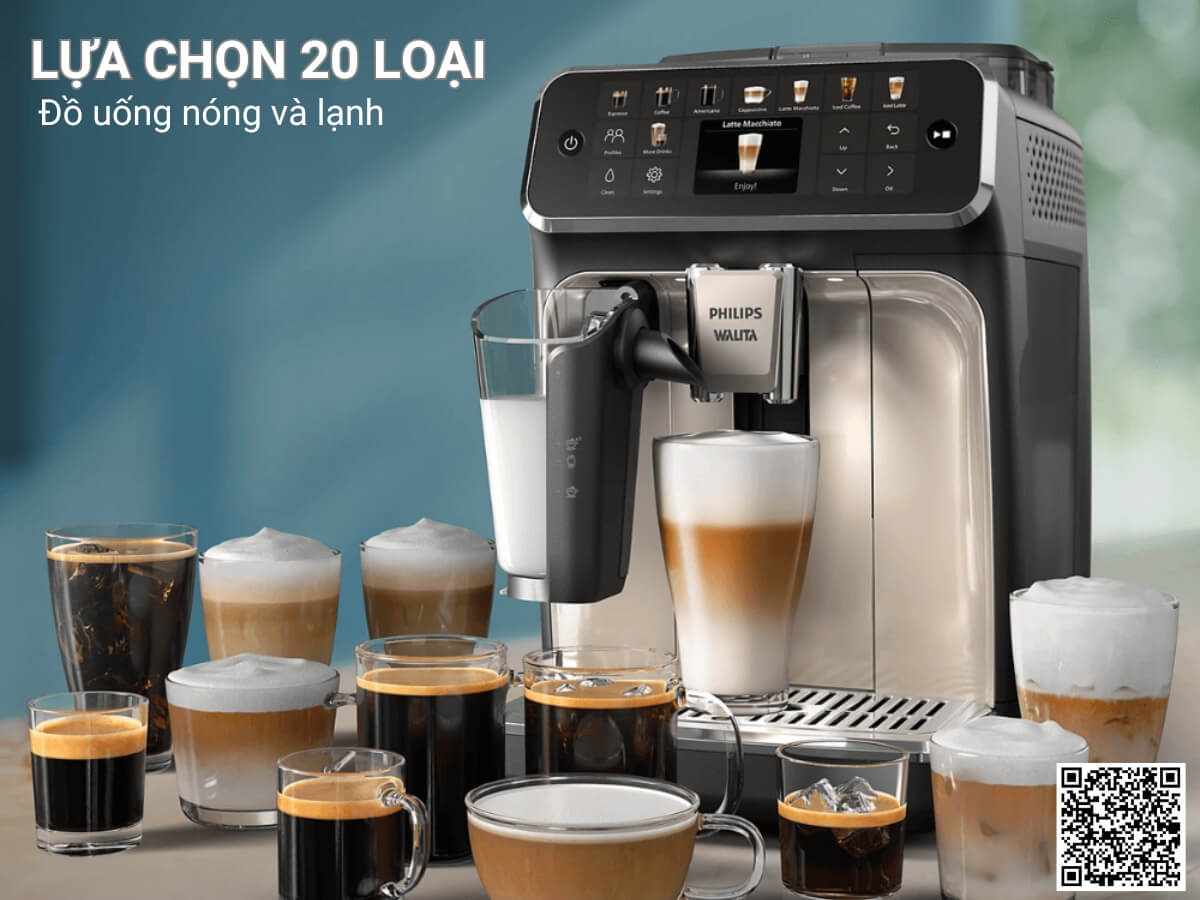 Máy pha cà phê Philips EP5547/90 đem đến 20 loại đồ uống đáp ứng khẩu vị đa dạng của người dùng, bao gồm: Espresso, Coffee, Americano, Iced Coffee, Cappuccino, Latte Macchiato, Flat white, Café au Lait, Caffe Latte, Caffé Crema, Ristretto, Espresso Lungo, Iced Latte, Iced Cappuccino, Iced Americano, Iced Caffè Crema, Iced Café au Lait, Iced Caffè Latte, Iced Espresso, Bọt sữa, và Nước nóng.