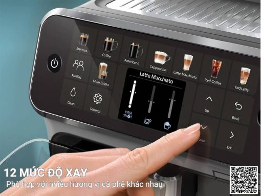 Máy pha cà phê Philips EP5547/90 sở hữu thiết kế sang trọng, tạo điểm nhấn ấn tượng cho không gian sử dụng, phù hợp dùng cho gia đình, văn phòng, khách sạn… Chức năng xay và pha cà phê tự động, kết hợp hệ thống tạo bọt sữa LatteGo không cần vòi đánh bọt, giúp bạn nhanh chóng có được ly cà phê thơm ngon đúng chuẩn. Với 12 mức độ xay dễ dàng tuỳ chỉnh phù hợp với nhiều hương vị cà phê khác nhau. Ngoài ra bạn cũng có thể điều chỉnh nhiệt độ, lượng nước và độ đậm đặc của cà phê, tạo ra 20 loại đồ uống nóng lạnh đa dạng – từ Espresso đậm đà đến Iced Cappuccino mát lạnh.