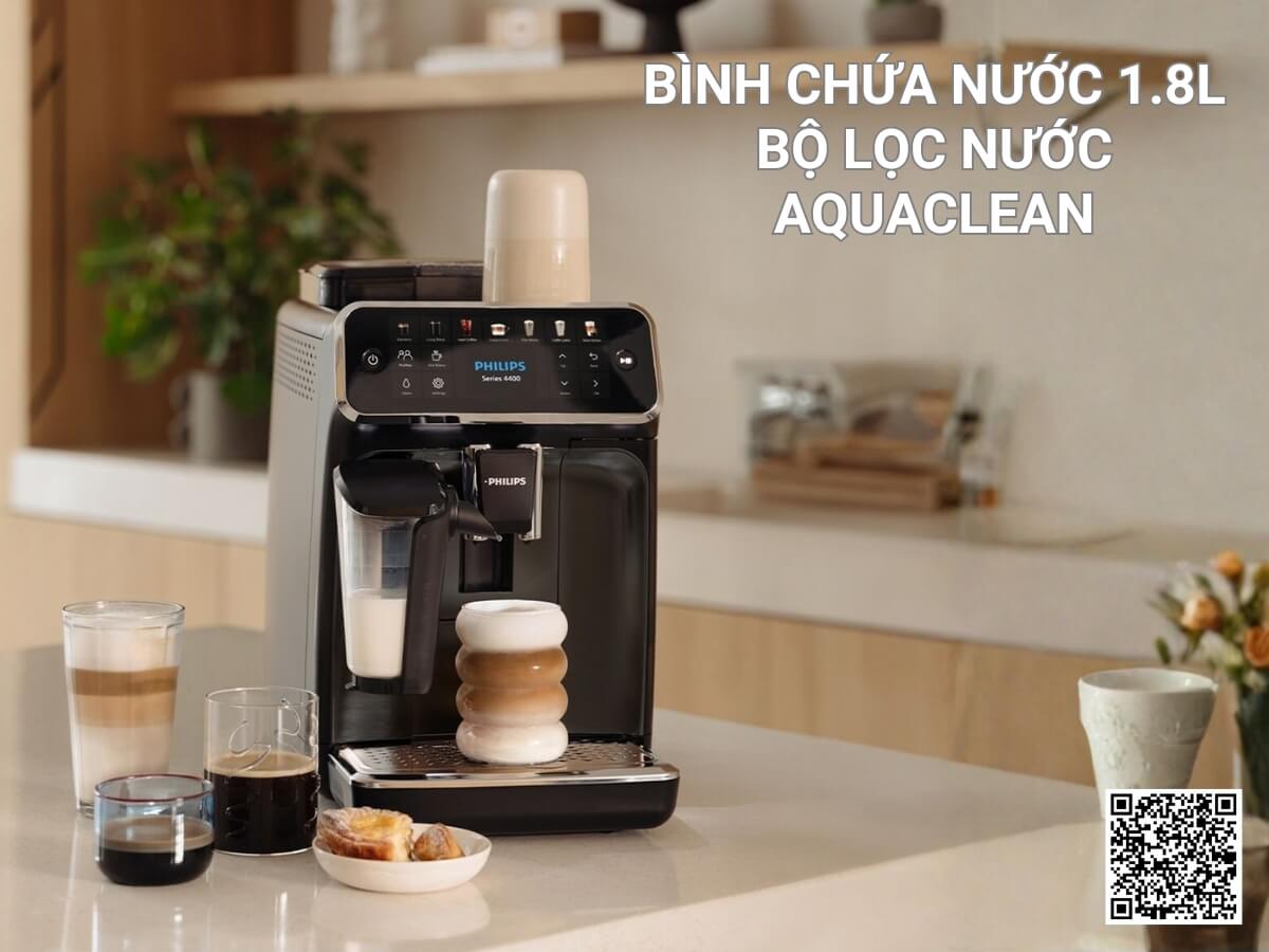 Máy pha cà phê Philips EP5547/90 trang bị bình chứa nước 1.8L, thoải mái chứa nước để sử dụng. Bình cũng được thiết kế tháo rời dễ vệ sinh và thêm nước khi cần. Đặc biệt, máy được tích hợp bộ lọc AquaClean đã được cấp bằng sáng chế về khả năng lọc sạch nước, giúp máy hoạt động hiệu quả. Bạn có thể pha chế tới 5000 tách cà phê mà không cần tẩy cặn. Máy sẽ tự động cảnh báo thay thế bộ lọc khi hết hạn.