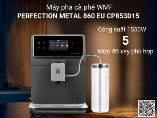 Máy pha cà phê WMF Perfection Metal 860 EU CP853D15 sở hữu thiết kế sang trọng, tạo điểm nhấn ấn tượng cho không gian sử dụng, phù hợp dùng cho gia đình, văn phòng, khách sạn… Chức năng xay và pha cà phê tự động, ngăn chứa hạt cà phê 250g, bình chứa nước 2 lít, cùng chức năng tạo bọt sữa mịn mướt, giúp bạn nhanh chóng có được ly cà phê thơm ngon đúng chuẩn. Với 5 mức độ xay dễ dàng tuỳ chỉnh phù hợp với nhiều hương vị cà phê khác nhau. Ngoài ra bạn cũng có thể điều chỉnh nhiệt độ, lượng nước và độ đậm đặc của cà phê, tạo ra những hương vị cà phê đa dạng như espresso, cappuccino, latte, macchiato, cà phê đen…