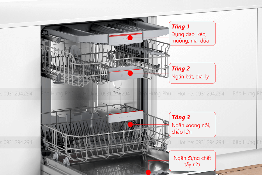 Đặc biệt, 3 dàn rửa được thiết kế thông minh, có thể điều chỉnh linh hoạt để tối ưu hóa không gian chứa, cho phép bạn dễ dàng sắp xếp được nhiều bát đĩa, đồ dùng và cả những nồi chảo và dụng cụ nấu có kích thước lớn mà không bị hạn chế về không gian. Đặc biệt là thiết kế dàn rửa thứ 3 ở trên cùng dành riêng cho các dụng cụ nhỏ như dao, kéo, đũa, muỗng, nĩa, chén đựng nước chấm… để tối ưu không gian chứa bên dưới.