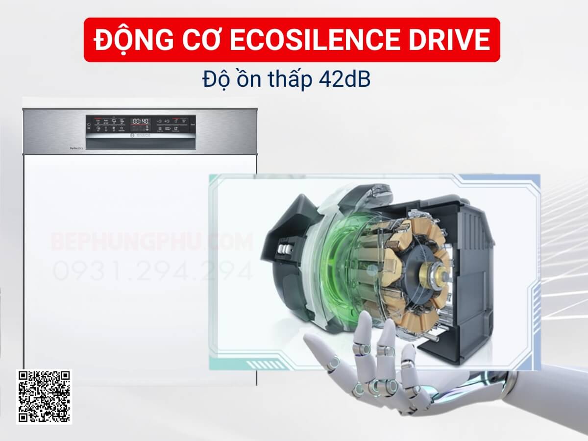 Máy rửa chén Bosch SMI6ZDS49E sử dụng động cơ không chổi than EcoSilence Drive ưu việt, được thiết kế để mang lại hiệu suất hoạt động mạnh mẽ, giảm tiếng ồn, tiết kiệm năng lượng và tăng tuổi thọ cho động cơ. Máy hoạt động với độ ồn thấp ở mức 42dB. Do đó máy hoạt động êm ái, nhẹ nhàng, gần như không gây tiếng ồn lớn ảnh hưởng đến sinh hoạt cũng như giấc ngủ của gia đình.