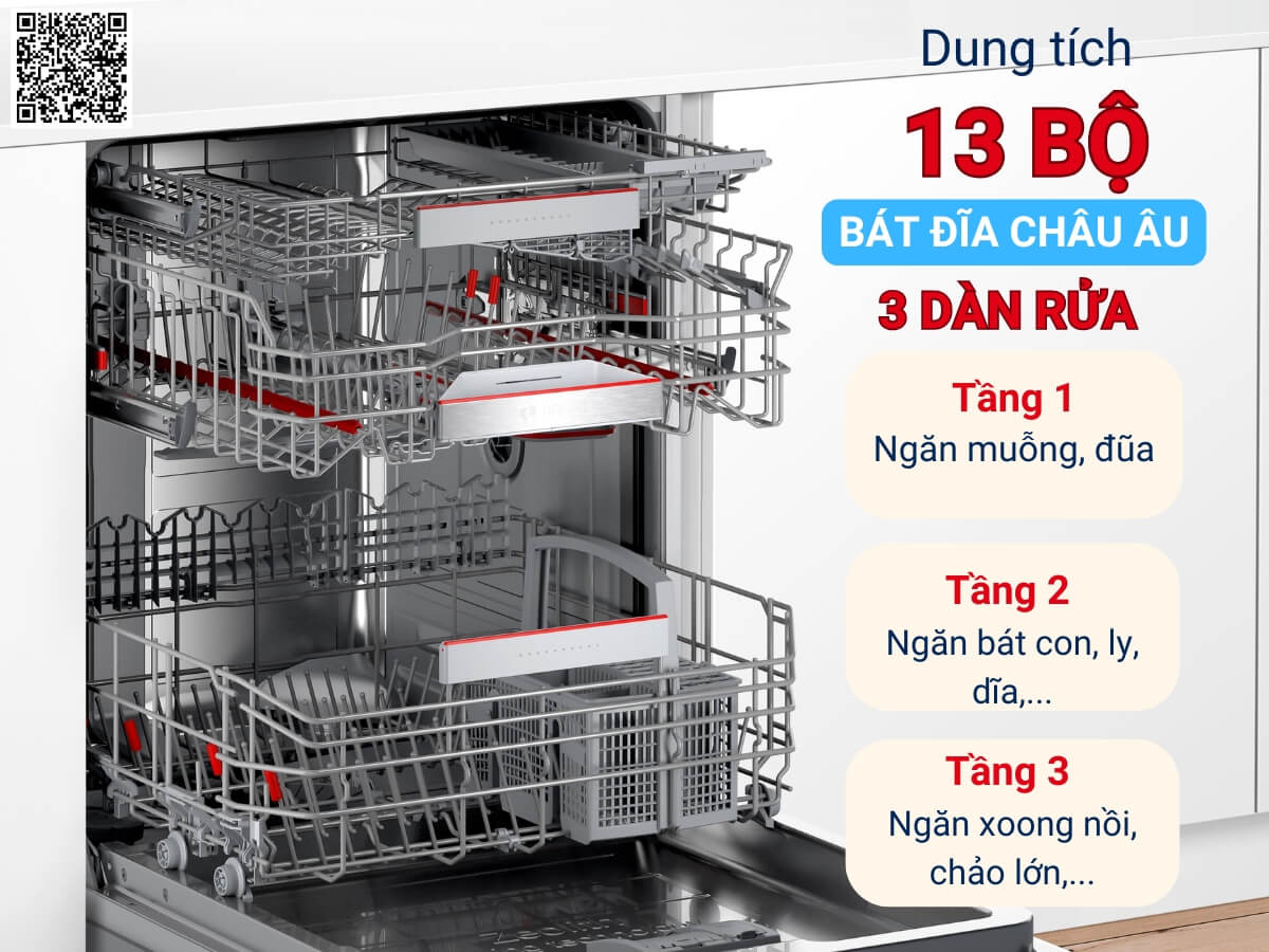 Máy rửa chén Bosch SMI6ZDS49E sở hữu khoang rửa rộng rãi, gồm 3 dàn rửa linh hoạt, cho phép máy rửa được chén bát, đồ dùng với dung tích lớn đến 13 bộ đồ ăn châu Âu, tương đương với 3 – 4 bữa ăn của gia đình Việt có 4 – 6 người. Với dung tích rửa lớn như vậy, có thể rửa sạch một lượng đồ dùng lớn trong mỗi lần rửa, tiết kiệm được nhiều thời gian và năng lượng tiêu thụ.