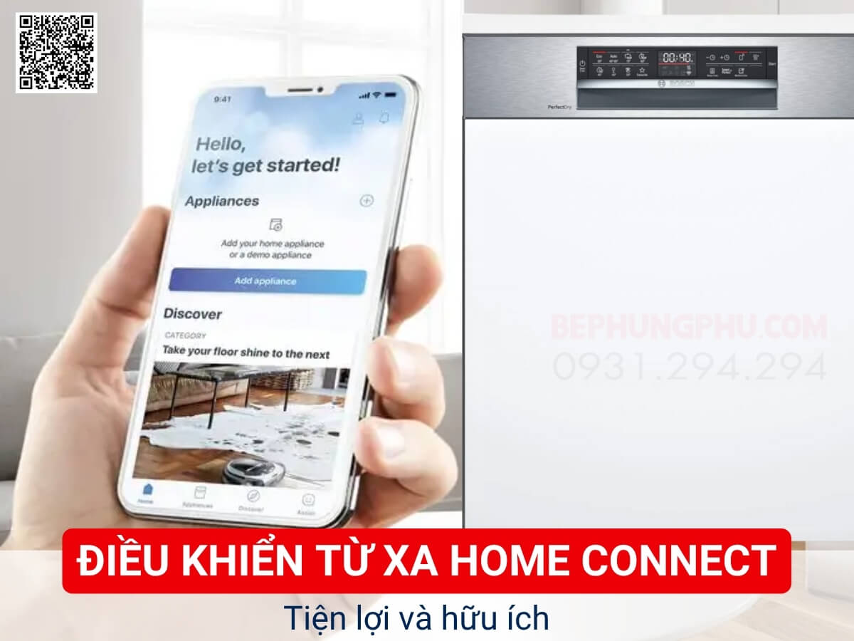 Máy rửa chén Bosch SMI6ZDS49E được trang bị tính năng điều khiển từ xa trên thiết bị di động thông qua ứng dụng Home Connect. Bạn có thể điều khiển máy rửa chén của mình từ bất cứ nơi đâu và bất cứ khi nào mà không cần thao tác trực tiếp trên máy, rất tiện lợi và linh hoạt. Với Home Connect, bạn có thể dễ dàng điều chỉnh các chế độ rửa, chọn sấy hé cửa, cài đặt thời gian hoạt động, kiểm tra tình trạng máy rửa chén, nhận thông báo lỗi nếu có…