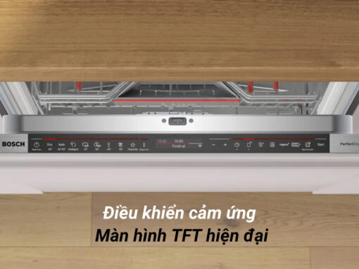 Máy rửa chén Bosch SMD8TCX04E thiết kế hệ thống điều khiển cảm ứng, màn hình TFT hiển thị, đảm bảo sử dụng dễ dàng, tiện lợi. Hệ thống điều khiển cảm ứng hiện đại, nhanh và nhạy, mọi thao tác chọn chương trình rửa hay các chức năng khác được thực hiện nhanh chóng, tiện lợi chỉ cần chạm nhẹ trên màn hình.