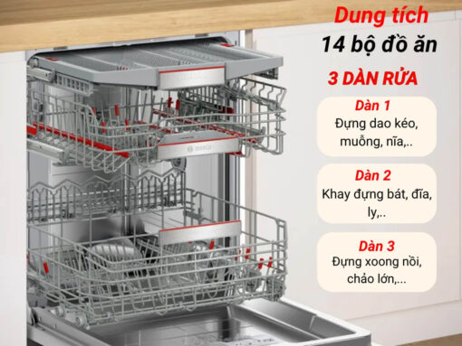 Máy rửa chén Bosch SMD8TCX04E sở hữu khoang rửa rộng rãi, gồm 3 dàn rửa linh hoạt, cho phép máy rửa được chén bát, đồ dùng với dung tích lớn đến 14 bộ đồ ăn châu Âu, tương đương với 3 – 4 bữa ăn của gia đình Việt có 4 – 6 người. Với dung tích rửa lớn như vậy, có thể rửa sạch một lượng đồ dùng lớn trong mỗi lần rửa, tiết kiệm được nhiều thời gian và năng lượng tiêu thụ.