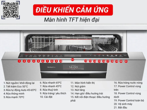 Máy rửa chén Bosch SMI8ZDS81T thiết kế hệ thống điều khiển cảm ứng, màn hình TFT hiển thị, đảm bảo sử dụng dễ dàng, tiện lợi. Hệ thống điều khiển cảm ứng hiện đại, nhanh và nhạy, mọi thao tác chọn chương trình rửa hay các chức năng khác được thực hiện nhanh chóng, tiện lợi chỉ cần chạm nhẹ trên màn hình.