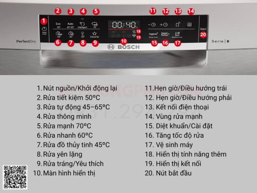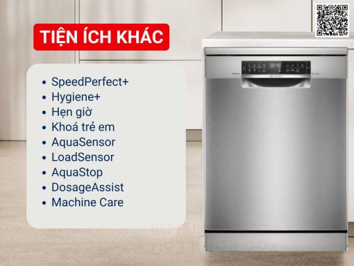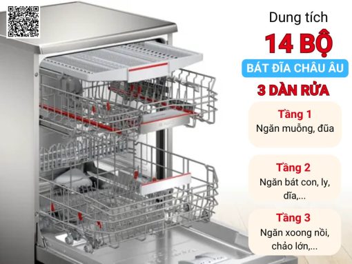 Series 6 dung tích 14 bộ đồ ăn châu Âu, được sản xuất và nhập khẩu trực tiếp từ Đức. Máy được trang bị đa dạng chương trình rửa phù hợp với nhiều nhu cầu khác nhau của người dùng. Đặc biệt là công nghệ sấy Zeolith giúp sấy khô bát đĩa một cách hiệu quả sau khi rửa, được đánh giá là một trong những công nghệ sấy hiệu quả và tiết kiệm nhất trên dòng máy rửa chén hiện nay. Máy rửa chén Bosch SMS6ZCI01P thiết kế độc lập sang trọng [caption id="attachment_106894" align="alignnone" width="1200"] 3 dàn rửa, dung tích 14 bộ đồ ăn châu Âu[/caption]Máy rửa chén Bosch SMS6ZCI01P thiết kế gồm 3 dàn rửa trên - giữa và dưới, với sức chứa tối đa 14 bộ bộ đồ ăn châu Âu, là lựa chọn lý tưởng cho gia đình có 4-6 thành viên. Đây là một trong những mức dung tích lớn nhất trên dòng máy rửa chén gia đình, với khoang rửa rộng rãi cho phép rửa được lượng lớn bát đĩa, đồ dùng trong mỗi lần rửa mà không cần phải chia nhỏ nhiều lần.Đặc biệt, 3 dàn rửa được thiết kế thông minh, có thể điều chỉnh linh hoạt để tối ưu hóa không gian chứa, cho phép bạn dễ dàng sắp xếp được nhiều bát đĩa, đồ dùng và cả những nồi chảo và dụng cụ nấu có kích thước lớn mà không bị hạn chế về không gian. Đặc biệt là thiết kế giỏ thứ 3 đặc biệt ở trên cùng dành riêng cho các dụng cụ nhỏ như dao, kéo, đũa, muỗng, nĩa, chén đựng nước chấm… để tối ưu không gian chứa bên dưới.  Đa dạng chương trình rửa [caption id="attachment_106896" align="alignnone" width="1200"] Công nghệ sấy khô Zeolith - sấy khô hoàn hảo và tiết kiệm điện[/caption]Máy rửa chén Bosch SMS6ZCI01P được trang bị công nghệ sấy Zeolith là một công nghệ sấy hiện đại và đáng chú ý nhất trên dòng máy rửa chén cao cấp của Bosch. Đây được đánh giá là công nghệ sấy hiệu quả và tiết kiệm điện nhất.Công nghệ này sử dụng các hạt khoáng tự nhiên Zeolith, với đặc tính hút ẩm cực tốt, sẽ hấp thụ hơi ẩm từ hơi nước trong giai đoạn rửa, sau đó được xử lý và giải phóng thành hơi ấm trong giai đoạn sấy. Luồng hơi ấm nóng này sẽ được bơm vào khoang máy, làm khô bát đĩa và quá trình này lặp lại cho đến khi bát đĩa được khô ráo hoàn toàn, không còn hơi ẩm và nước đọng. Với sấy Zeolith, bát đĩa và đồ dùng sẽ được sấy khô một cách hiệu quả, đồng thời rất tiết kiệm điện. Chương trình rửa thông minh Intelligent Khi chọn chương trình rửa thông minh Intelligent thì sau khi kết thúc quá trình rửa, bạn có thể vào ứng dụng Home Connect để đánh giá kết quả làm sạch và làm khô cũng như thời lượng của chương trình. Dựa vào đánh giá đó, máy rửa bát sẽ điều chỉnh các cài đặt và cung cấp các lựa chọn thay thế tối ưu hơn để cho kết quả rửa sạch sấy khô tốt hơn, tiết kiệm năng lượng hơn. Ngoài ra, chương trình cung cấp cho bạn các chỉ số về tiêu thụ nước và năng lượng hoàn toàn rõ rãng và minh bạch. Điều khiển cảm ứng và màn hình LED hiện đại [caption id="attachment_108049" align="alignnone" width="1200"] Động cơ không chổi than EcoSilence Drive, độ ồn thấp 40dB[/caption]Máy rửa chén Bosch SMS6ZCI01P ứng dụng công nghệ động cơ không chổi than EcoSilence Drive được thiết kế đặc biệt để giảm ma sát trong quá trình hoạt động, giúp máy làm việc hiệu quả hơn, yên tĩnh và bền bỉ hơn, đồng thời tiết kiệm năng lượng hiệu quả.Độ ồn tối đa ở mức 40dB được đánh giá là mức độ tiếng ồn khá thấp, không gây ảnh hưởng đến không gian sinh hoạt và nghỉ ngơi của gia đình. Với mức độ ồn này, bạn có thể yên tâm sử dụng máy rửa chén Bosch SMS6ZCI16E vào ban đêm hay sáng sớm mà không lo ảnh hưởng đến giấc ngủ của các thành viên trong gia đình. Điều khiển từ xa Home Connect tiện lợi [caption id="attachment_106901" align="alignnone" width="1200"] Nhiều tính năng tiện ích, an toàn[/caption]- SpeedPerfect+: Chế độ rửa nhanh tăng cường cho phép giảm đến 75% thời gian rửa nhưng vẫn đảm bảo hiệu quả rửa sạch.- Hygiene+: tăng nhiệt độ nước trong giai đoạn rửa cuối lên khoảng 70°C và duy trì trong 10 phút, giúp loại bỏ hiệu quả vi khuẩn, vi rút trên chén bát, đảm bảo an toàn.- Hẹn giờ: Cho phép người dùng cài đặt thời gian để máy tự khởi động trong khoảng từ 1 đến 24 giờ. Bạn có thể cài đặt rửa chén vào ban đêm để sáng hôm sau có ngay bát đĩa sạch để sẵn sàng sử dụng.- Khoá trẻ em: Kích hoạt tính năng này sẽ làm vô hiệu hóa bảng điều khiển của máy, ngăn không cho trẻ em tự ý điều khiển máy khi không có sự giám sát của người lớn.- AquaSensor: Tính năng này hoạt động dựa trên cảm biến nước, đo lường độ bẩn của các vật dụng và điều chỉnh chu trình rửa chén để đảm bảo sử dụng lượng nước tối ưu nhất.- LoadSensor: Tính năng này giúp đo lường khối lượng bát đĩa trong máy rửa chén và tự động điều chỉnh mức nước cần thiết để đảm bảo hiệu quả rửa sạch và tiết kiệm