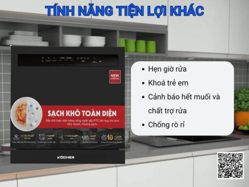 Máy rửa chén Kocher X10 Pro thiết kế để bàn nhỏ gọn, vỏ máy sơn tĩnh điện màu đen dễ kết hợp với mọi không gian nội thất. 2 dàn rửa với dung tích lớn 10 bộ đồ ăn, phù hợp cho gia đình ít người, không gian bếp nhỏ. Máy được trang bị 8 chương trình rửa cơ bản cùng nhiều chức năng nâng cao được thiết lập sẵn, đáp ứng đa dạng nhu cầu của người dùng. Đặc biệt còn có công nghệ sấy khô tăng cường Extra Dry hỗ trợ làm khô chén bát nhanh chóng, hiệu quả. Và công nghệ Fresh Air bảo quản khí tươi đến 72h giúp ngăn chặn mùi hôi, ẩm mốc và vi khuẩn, bảo vệ tối đa cho ngươi dùng.