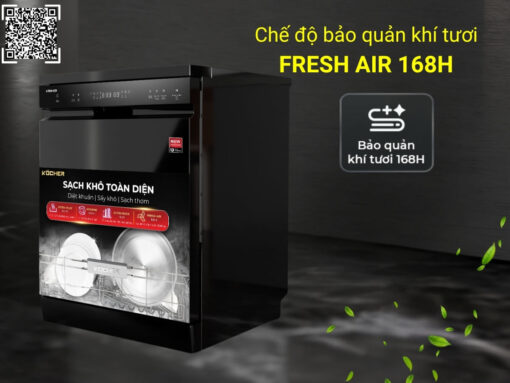 Máy rửa chén Kocher X15B còn có chế độ bảo quản khí tươi Fresh Air 168h, cung cấp luồng không khí luân chuyển liên tục trong khoang máy, giữ cho khoang máy luôn khô thoáng, ngăn hình thành và phát triển vi khuẩn, nấm mốc, giữ cho bát đĩa luôn khô ráo và sạch khuẩn suốt 168 tiếng sau chu trình rửa.