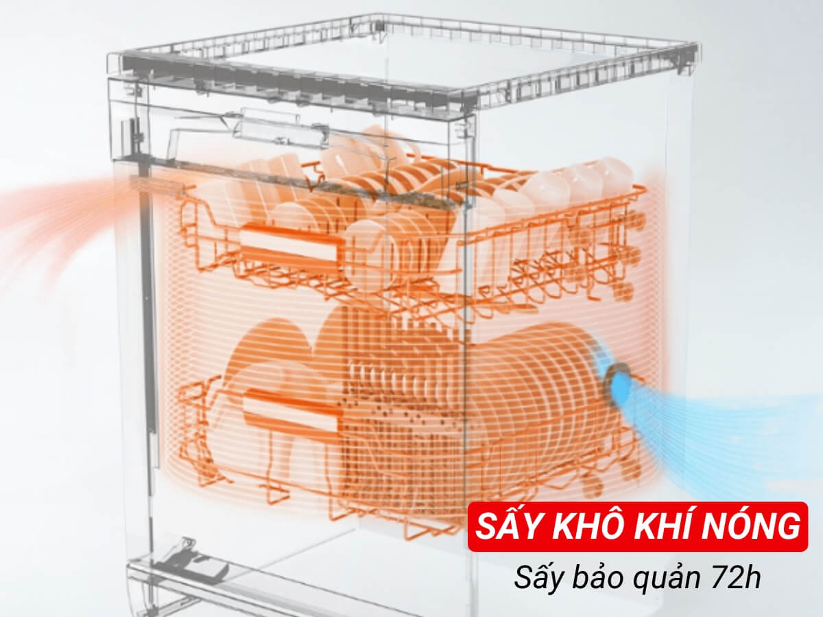 – Sấy bảo quản 72h: Sau khi rửa và sấy khô, không khí lưu thông và giữ cho chén bát luôn khô thoáng lên đến 72 giờ, giúp khử mùi hôi hiệu quả.
