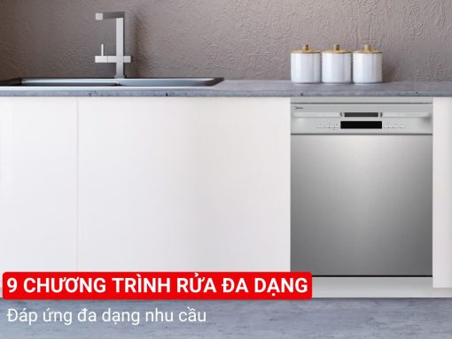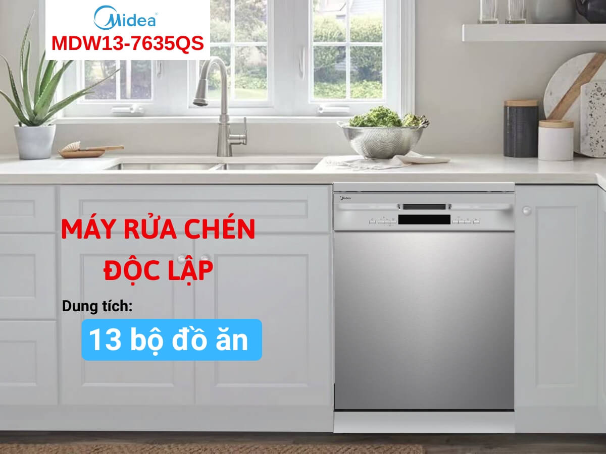 Máy rửa chén Midea MDW13-7635QS thiết kế độc lập tiện lợi, linh hoạt lắp đặt. Thiết kế 2 dàn rửa với dung tích 13 bộ đồ ăn Châu Âu, phù hợp với nhiều gia đình Việt. 9 chương trình rửa tự động phù hợp với lượng chén bát, độ bẩn cũng như nhu cầu sử dụng. Đặc biệt có công nghệ sấy khô khí nóng và sấy bảo quản 72h, cùng đèn UV diệt khuẩn hỗ trợ làm khô chén bát và diệt khuẩn, ngăn tích tụ hơi ẩm, mùi hôi hiệu quả. Hệ thống điều khiển nút nhấn điện tử với màn hình LED hiện đại, dễ sử dụng, phù hợp với mọi người dùng.