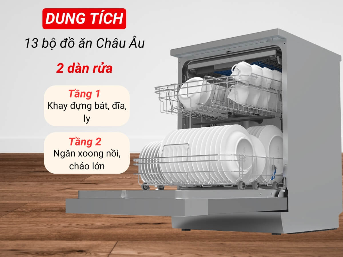 Với dung tích 13 bộ đồ ăn châu Âu, cho phép rửa được số lượng bát đĩa, đồ dùng lớn trong mỗi lần rửa, giúp tiết kiệm nước và điện năng cũng như thời gian cho việc rửa chén.