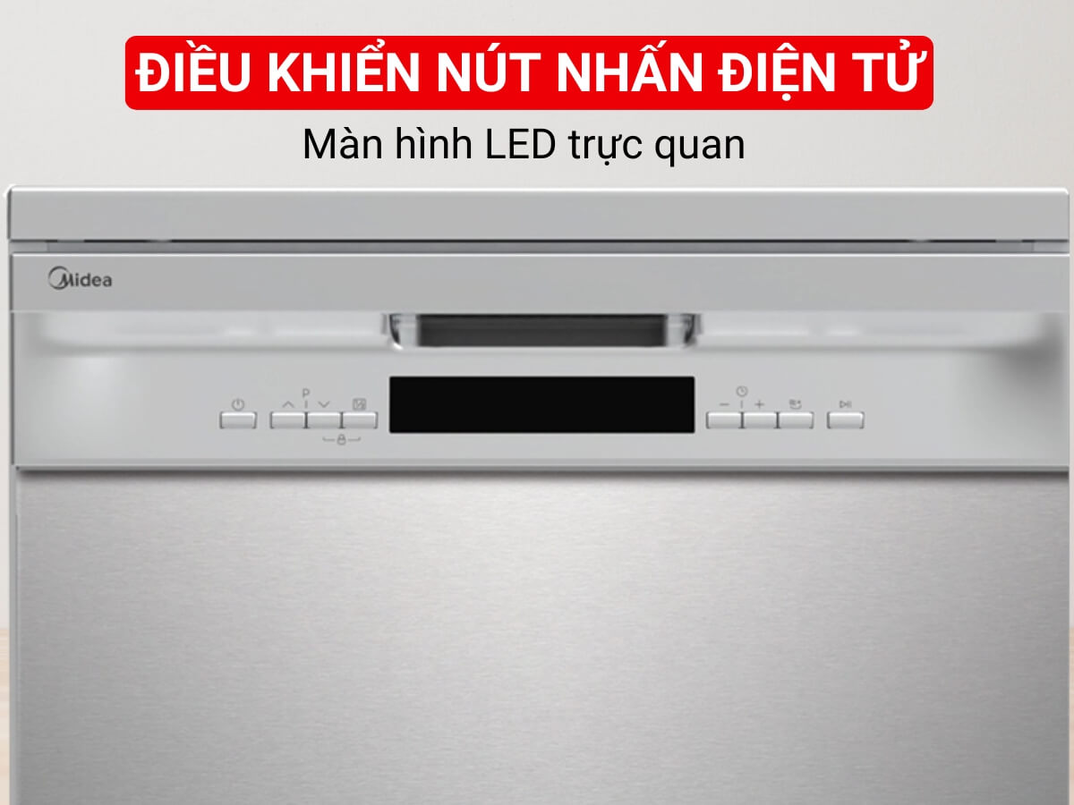 Máy rửa chén Midea MDW13-7635QS có bảng điều khiển nút nhấn điện tử được thiết kế đơn giản, dễ sử dụng, người dùng có thể chọn các chế độ rửa và chức năng khác chỉ bằng cách nhấn nhẹ nút. Kết hợp với màn hình LED giúp dễ dàng theo dõi tiến trình rửa, thời gian còn lại của chương trình cũng như nhận thông báo lỗi nếu có.