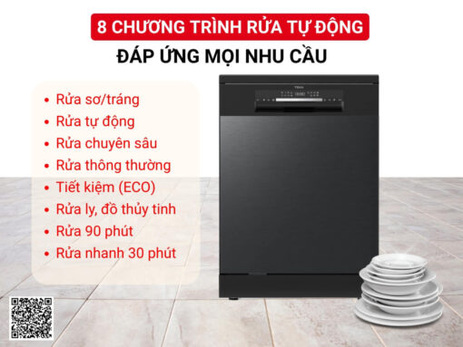 Máy rửa chén Teka DFS 650ZB-TSEA thiết kế độc lập sang trọng, màu thép đen không gỉ dễ kết hợp với mọi không gian nội thất. Với 3 dàn rửa linh hoạt và dung tích lớn 15 bộ đồ ăn, máy thoải mái đáp ứng nhu cầu sử dụng cho gia đình đông người. Với 8 chương trình rửa cài đặt sẵn, máy đáp ứng đa dạng nhu cầu của người dùng. Đặc biệt còn có công nghệ sấy tăng cường kết hợp tự động hé cửa AutoOpen giúp làm khô chén bát hiệu quả, đèn UV diệt khuẩn đảm bảo an toàn, động cơ Inverter vận hành êm ái… mang đến trải nghiệm sử dụng hoàn hảo cho gia đình.