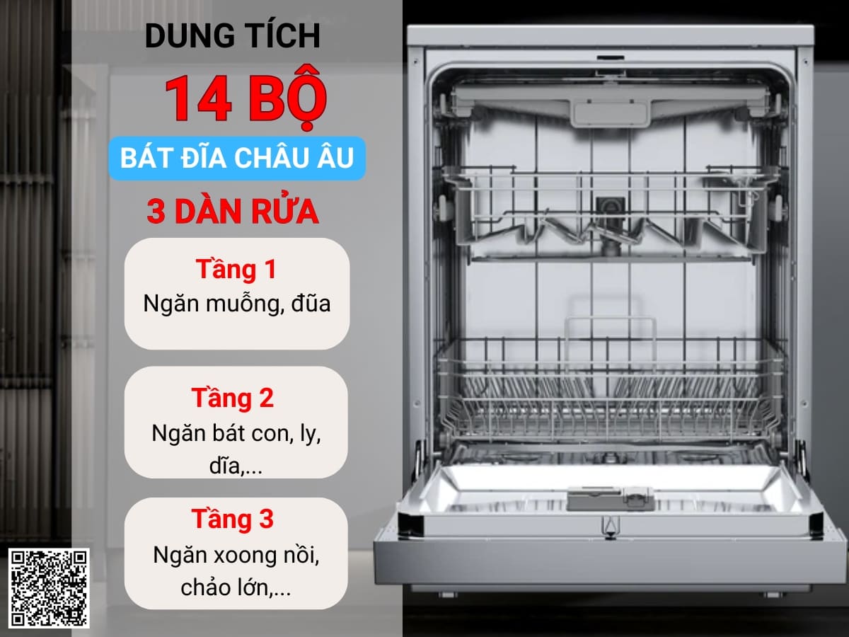3 dàn rửa – dung tích 14 bộ đồ ăn châu Âu