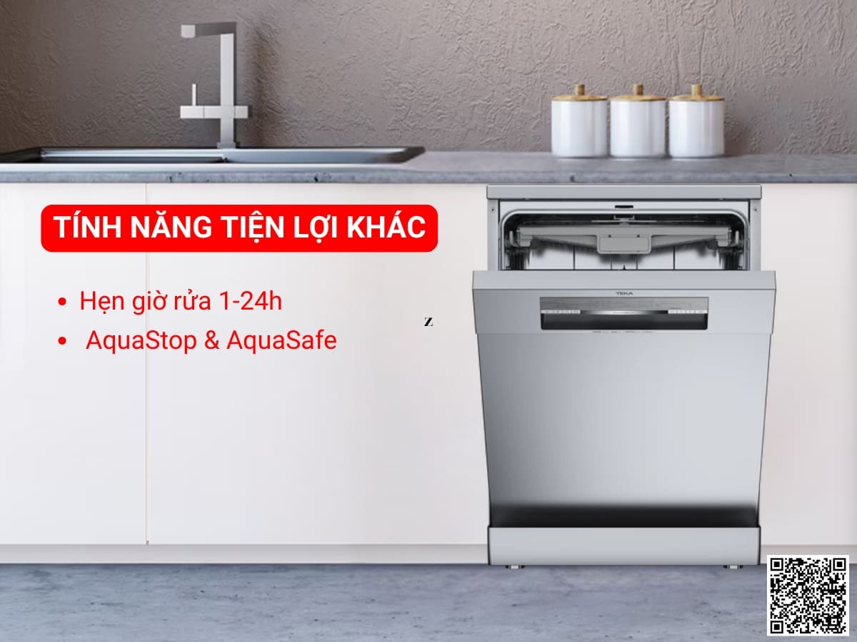 Máy rửa chén Teka DFS 76850 phiên bản PremiumCare thiết kế độc lập sang trọng, dễ dàng kết hợp với mọi không gian nội thất. Với dung tích lớn 14 bộ đồ ăn châu Âu cùng 3 dàn rửa linh hoạt bao gồm cả vòi phun thứ ba, máy thoải mái đáp ứng nhu cầu sử dụng cho gia đình đông thành viên. Động cơ Inverter giúp máy vận hành êm ái, tiết kiệm điện năng vượt trội. Với 8 chương trình rửa cài đặt sẵn và các công nghệ hiện đại như cảm biến độ bẩn AquaLogic, kháng khuẩn IonClean và tự động hé cửa khi sấy xong, máy mang đến trải nghiệm sử dụng tiện lợi và hiệu quả tối ưu cho gia đình.