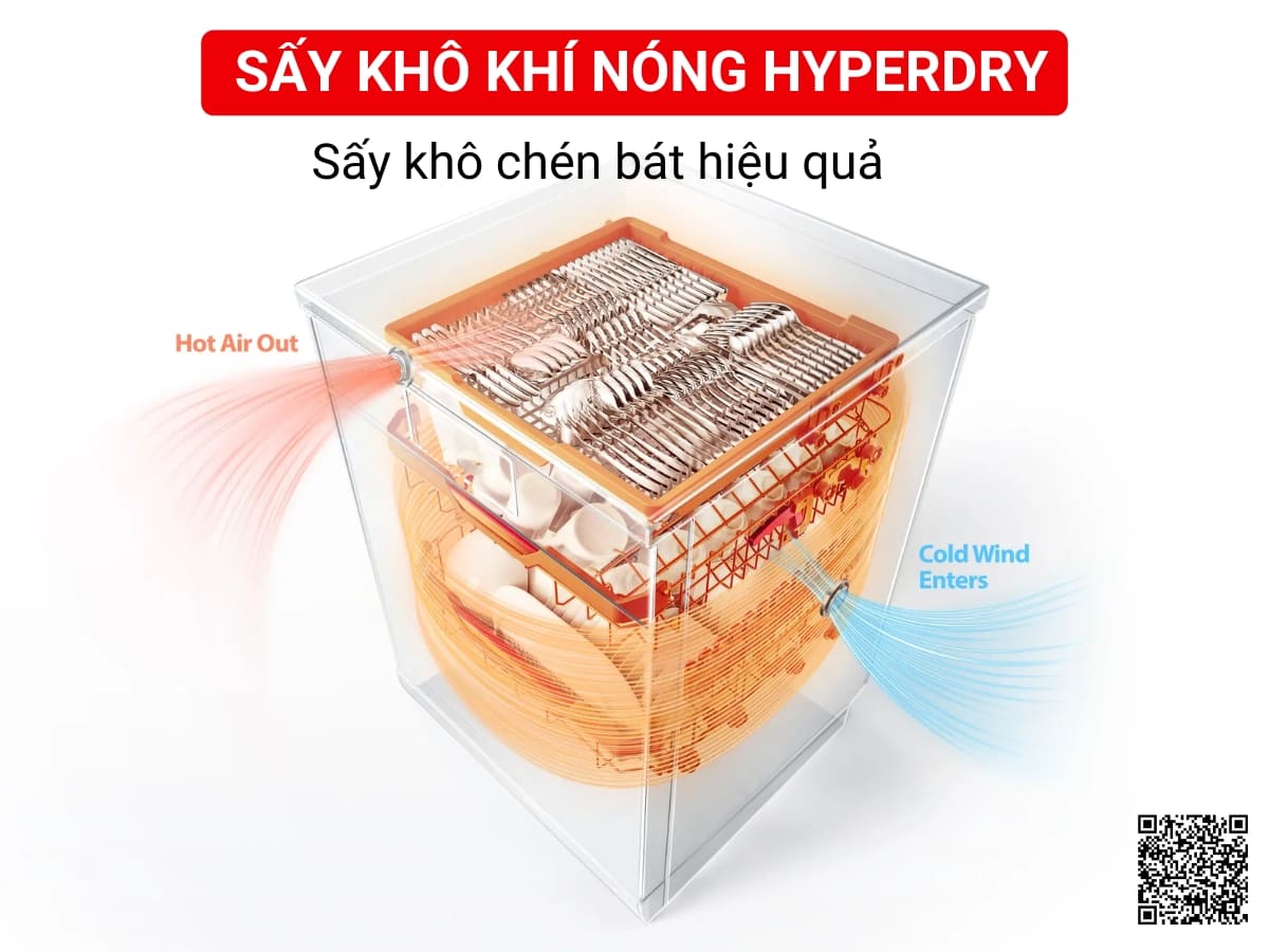 Máy rửa chén Toshiba DW-15F7(G)-VN trang bị công nghệ sấy khô khí nóng HyperDry cung cấp luồng khí nóng tuần hoàn hỗ trợ làm khô chén bát hiệu quả sau khi rửa mà không cần phải phơi hay lau lại.