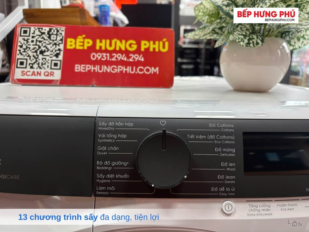 – Hẹn giờ sấy: cho phép bạn cài đặt sẵn thời gian kết thúc của chương trình sấy (từ 1 đến 24 giờ), giúp chủ động kiểm soát thời gian sấy đồ.