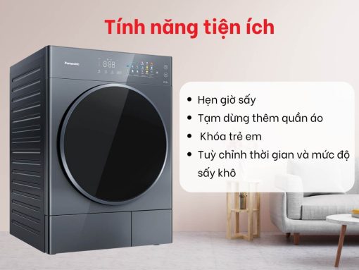 – Hẹn giờ sấy: cho phép bạn cài đặt sẵn thời gian kết thúc của chương trình sấy (từ 1 đến 24 giờ), giúp chủ động kiểm soát thời gian sấy đồ.