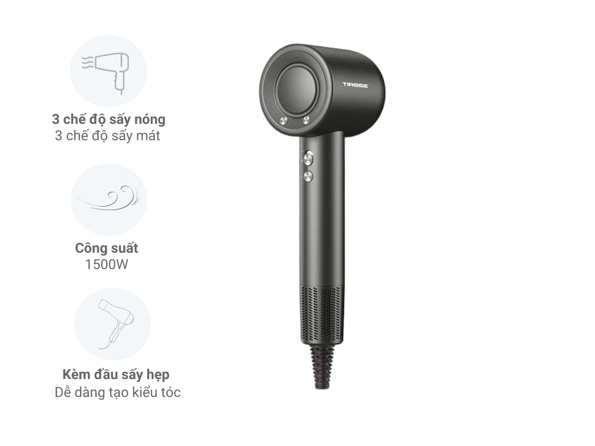 Máy sấy tóc tốc độ cao Tiross TS4322 sở hữu thiết kế đẹp, nhỏ gọn, cầm vừa trong tay, tạo cảm giác thoải mái khi sử dụng và dễ dàng mang theo đi du lịch, về quê… Công suất 1500W mạnh mẽ giúp sấy siêu nhanh, tiết kiệm thời gian. Máy có 3 mức nhiệt sấy mát và 3 mức nhiệt sấy nóng, được hiển thị qua đèn LED thông minh (trắng và đỏ), đáp ứng đầy đủ nhu cầu sử dụng cho các chị em. Đặc biệt, máy có chế độ tự ngắt khi quá nhiệt, đảm bảo an toàn tuyệt đối. Cùng đầu sấy hẹp từ tính đi kèm giúp tạo kiểu tóc hiệu quả.