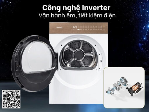 Máy sấy Toshiba TD-T37BS90HWV(WT) được trang bị công nghệ Origin Inverter – công nghệ biến tần hiện đại giúp máy vận hành êm ái, giảm tiếng ồn, tiết kiệm điện hiệu quả và kéo dài tuổi thọ động cơ.