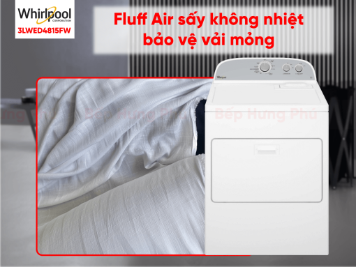 Tính năng sấy khô không cần nhiệt Fluff Air sử dụng một luồng không khí mát để làm khô quần áo một cách nhẹ nhàng và an toàn. Không chỉ giúp sấy khô quần áo, tính năng này còn giúp loại bỏ bụi, xơ vải, lông vật nuôi và các hạt bụi nhỏ khác, giúp giữ cho quần áo sạch sẽ và tươi mới hơn. Với tính năng này, người dùng có thể sấy khô quần áo mà không cần sử dụng nhiệt độ cao, giúp bảo vệ quần áo khỏi những tác động tiêu cực của nhiệt độ cao. Chương trình sấy này rất hữu ích với các loại vải nhạy cảm với nhiệt như lụa, ren…