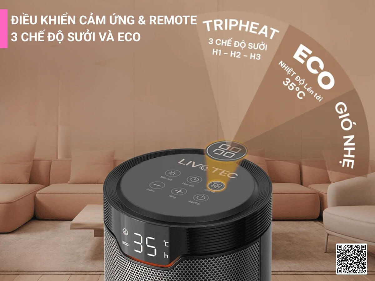 Điều khiển cảm ứng & remote, 3 chế độ sưởi và Eco