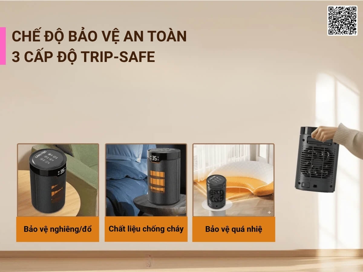 Máy sưởi gốm Livotec LCH-1597D được trang bị nhiều cơ chế bảo vệ an toàn 3 cấp độ (Trip-Safe) để bạn yên tâm sử dụng: