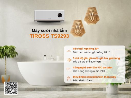Máy sưởi nhà tắm Tiross TS9293 với thiết kế treo tường hiện đại, diện tích sử dụng lên đến 20m²