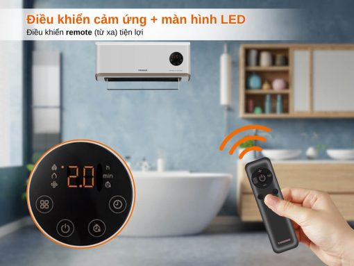 Máy sưởi nhà tắm Tiross TS9293 được tích hợp bảng điều khiển cảm ứng hiện đại cùng màn hình LED hiển thị rõ ràng. Người dùng có thể dễ dàng lựa chọn 3 chế độ gió: gió mát – gió ấm – gió nóng, tùy theo nhu cầu và thời tiết. Ngoài ra, thiết bị còn đi kèm điều khiển từ xa, giúp bạn thao tác tiện lợi mà không cần chạm trực tiếp vào máy.