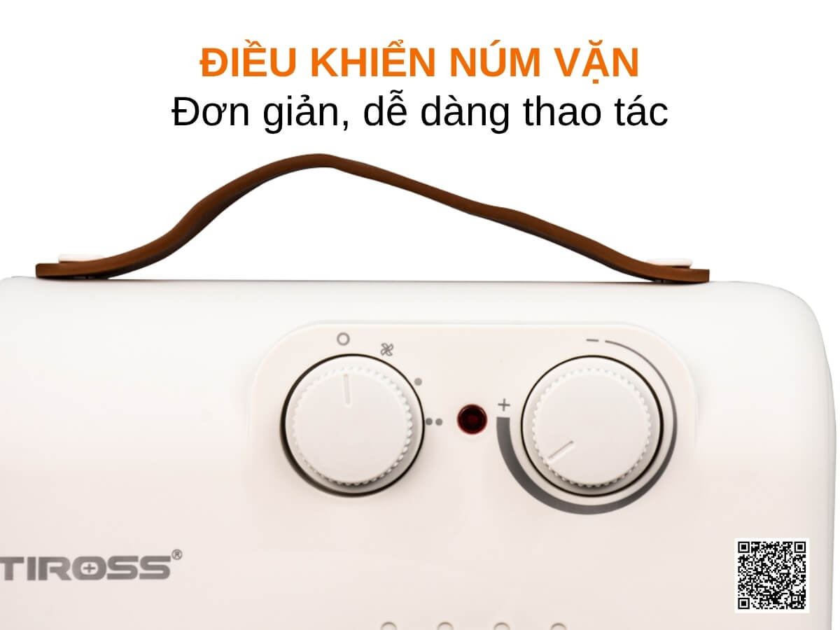 Máy sưởi Tiross TS9445 sử dụng núm vặn cơ đơn giản, dễ thao tác, cho phép bạn điều chỉnh mức nhiệt nhanh chóng và chính xác. Sản phẩm còn được trang bị đèn báo nguồn, giúp người dùng dễ dàng nhận biết trạng thái hoạt động của máy. Cách điều khiển truyền thống này phù hợp với mọi đối tượng, kể cả người lớn tuổi.