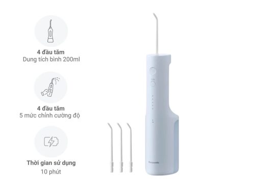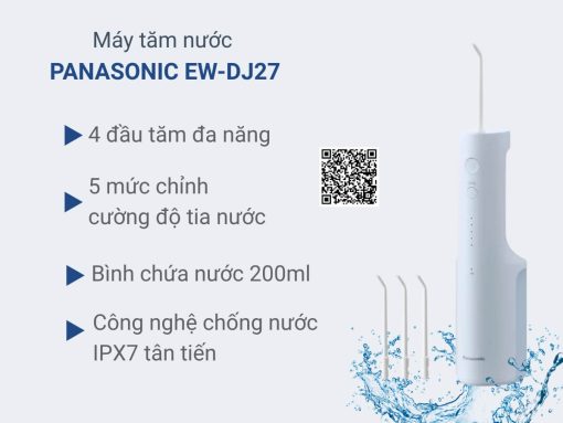 Máy tăm nước Panasonic EW-DJ27 là thiết bị chăm sóc răng miệng hiệu quả, với công nghệ sóng siêu âm tạo tia nước mạnh giúp làm sạch sâu bề mặt và kẽ răng, làm sạch túi nha chu, chăm sóc nướu… Có 4 đầu tăm với 5 mức điều chỉnh tia nước, đáp ứng nhu cầu sử dụng đa dạng và phù hợp với nhiều đối tượng người dùng.