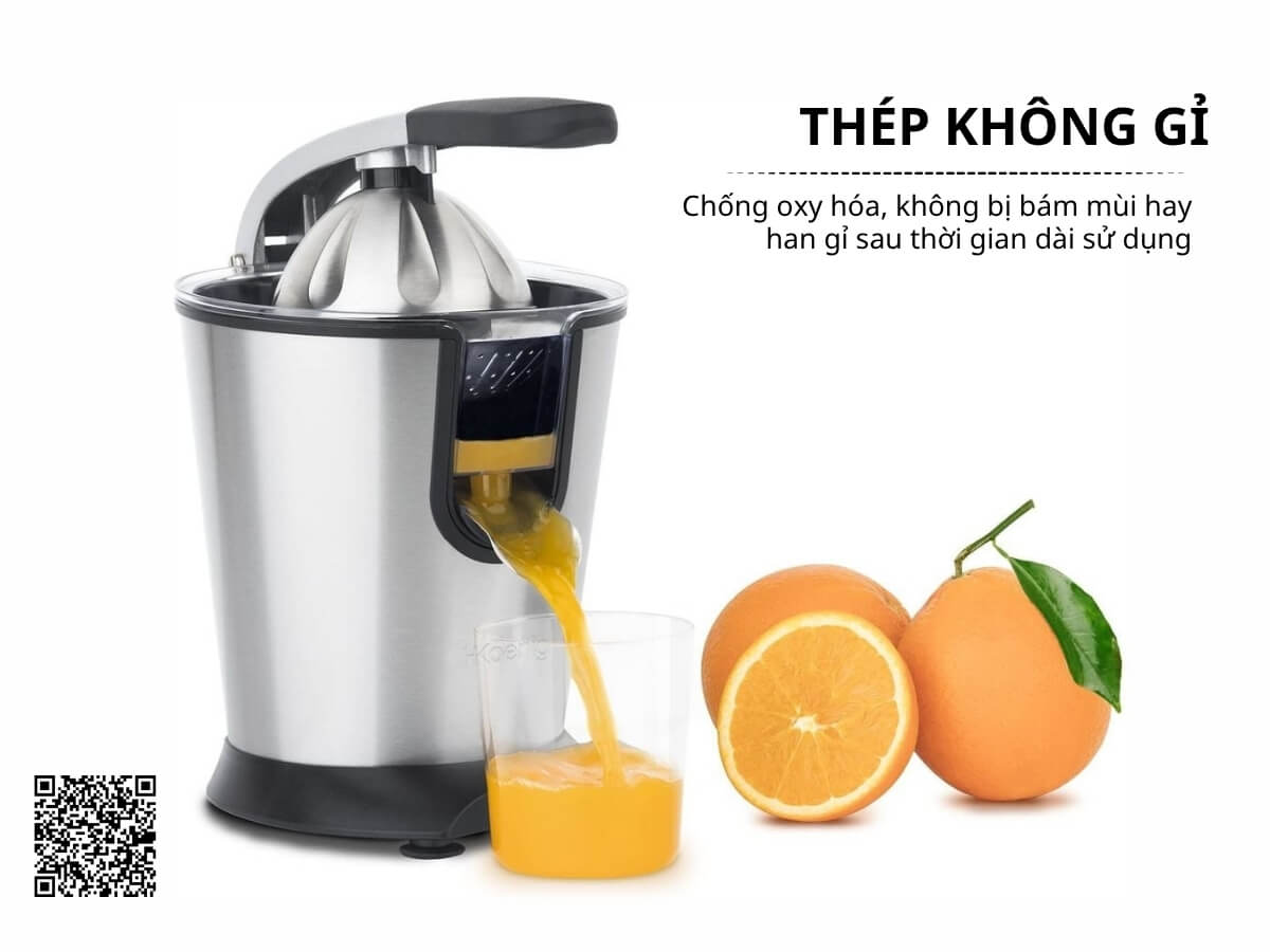 Toàn bộ thân máy và cối ép được làm từ thép không gỉ (inox) chất lượng cao, đảm bảo độ bền và tính an toàn tuyệt đối khi tiếp xúc với thực phẩm. Chất liệu này giúp máy chống oxy hóa, không bị bám mùi hay han gỉ sau thời gian dài sử dụng. Lưới lọc inox giúp loại bỏ hoàn toàn phần bã, hạt và tạp chất, mang đến ly nước cam nguyên chất, an toàn cho sức khỏe. Bên cạnh đó, máy được thiết kế chắc chắn, cầm nắm dễ dàng và hoạt động ổn định nhờ đế chống trượt.