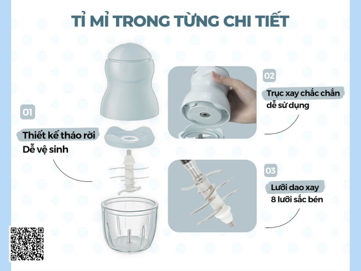 Máy xay ăn dặm Bear GR-B03V8 có thiết kế tháo rời thông minh, giúp việc vệ sinh trở nên dễ dàng và nhanh chóng. Người dùng có thể tháo rời cối, nắp và lưỡi dao để rửa sạch từng bộ phận, tránh bám cặn hay mùi thực phẩm. Với chất liệu thủy tinh trơn nhẵn và silicon chống dính, máy không lưu lại mùi thức ăn, giữ được độ mới lâu dài.